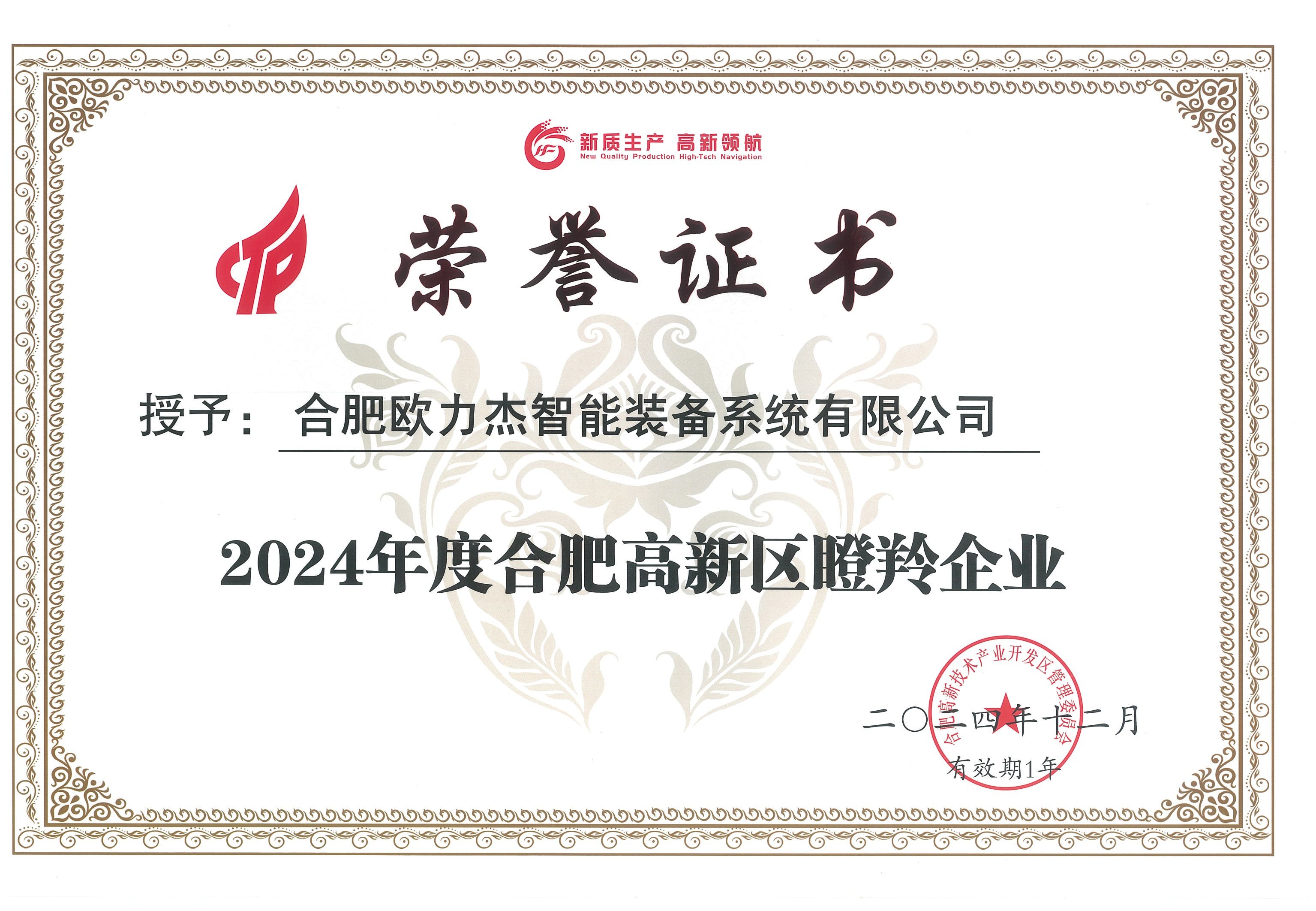 近日,合肥市高新區(qū)2024年度高成長(zhǎng)企業(yè)榜單發(fā)布,歐力杰再次獲得“2024年度合肥高新區(qū)瞪羚企業(yè)”稱號(hào),這是公司繼2023年首次獲得該殊榮后二次通過認(rèn)定,充分彰顯了合肥高新區(qū)政府及權(quán)威審核機(jī)構(gòu)對(duì)我公司在成長(zhǎng)速度、創(chuàng)新能力及管理規(guī)范方面的高度認(rèn)可。