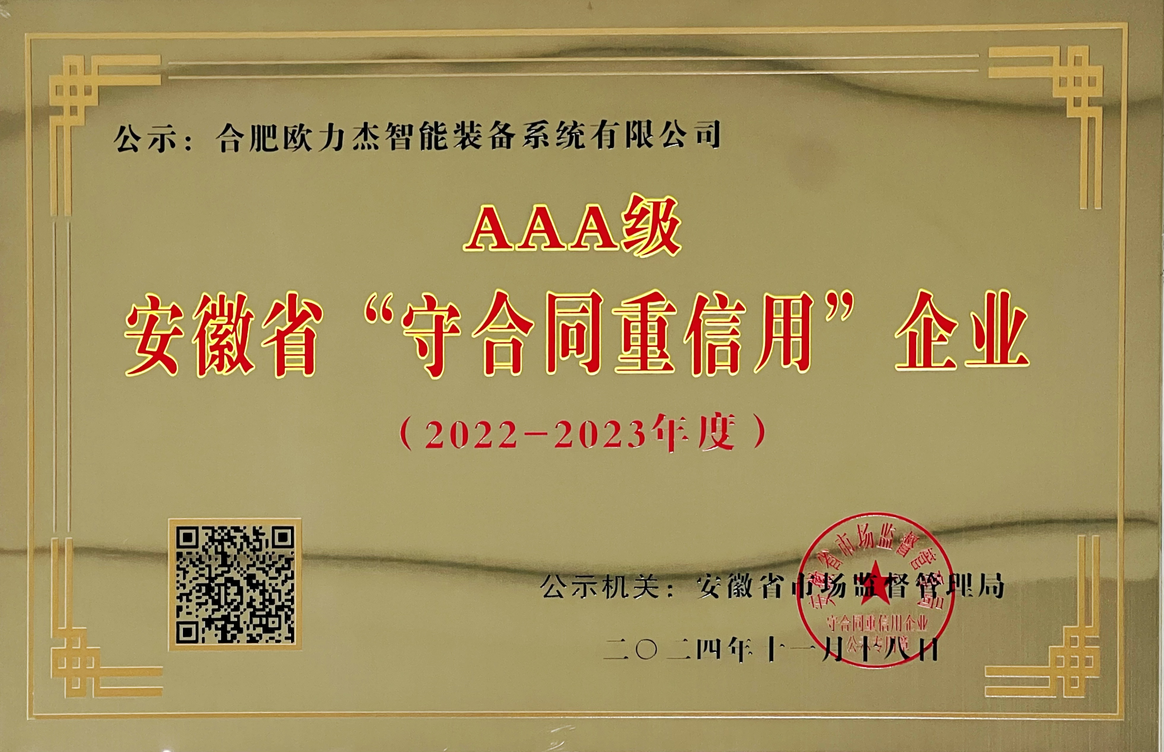 近日,安徽省市場監(jiān)督管理局發(fā)布2022-2023年度“安徽省守合同重信用”AAA級企業(yè)名單,合肥歐力杰智能裝備系統(tǒng)有限公司成功入選。